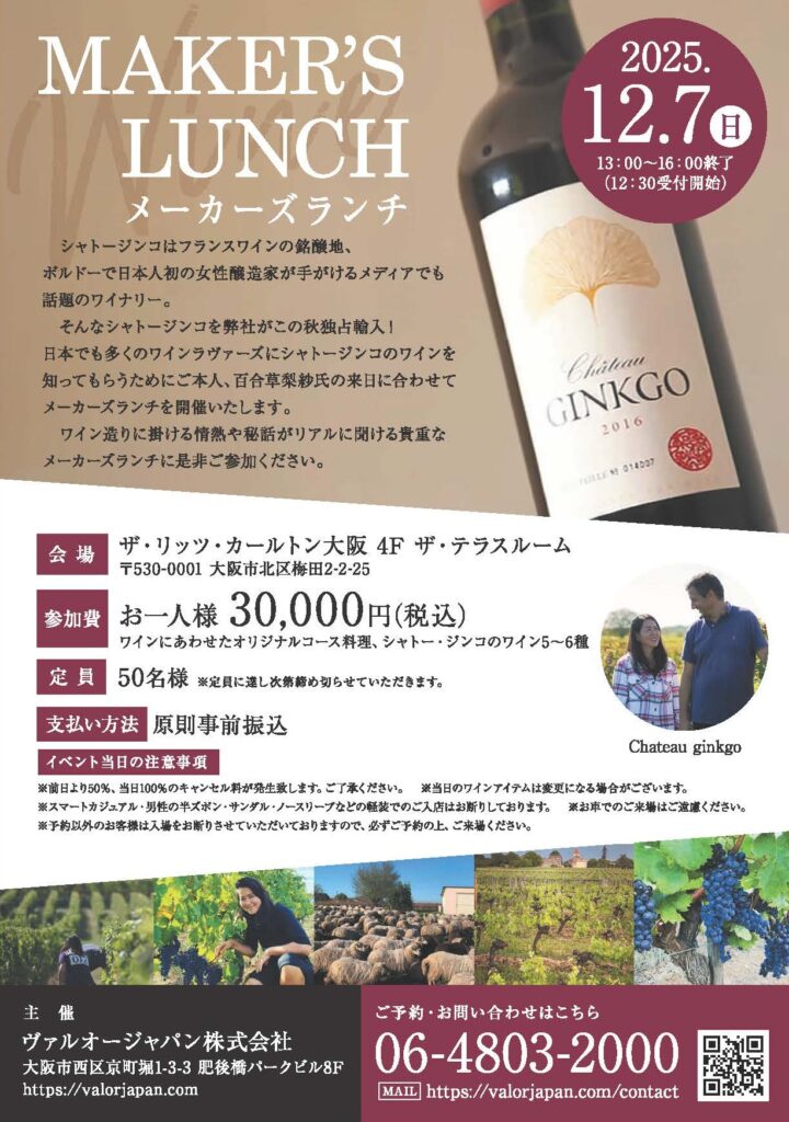 そのシャトージンコから百合草梨沙氏を招いて「ザ・リッツカールトン大阪」にてメーカーズランチ開催が決定しました!